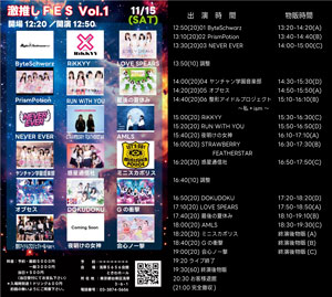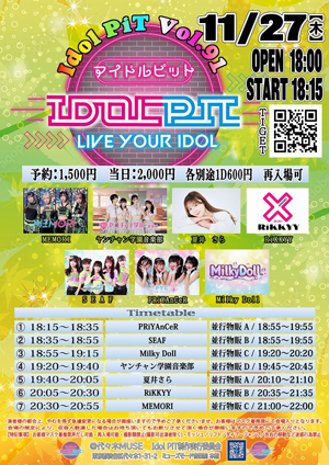 | 11月15日(土) | SHINJUKU IDOL VALUE-1115- 会場:新宿アイドルステージ 時間:【開場】18:00【開演】18:20 料金 :※各別途1D 前方Sチケット ¥3000 一般Aチケット ¥2000 当日各+¥500 ※再入場時1Drink チケットのご購入はこちら↓ 予約:11/12 22:00~11/15 18:00 ![]() 詳細はTwitterにて (@YGakuenmember) |