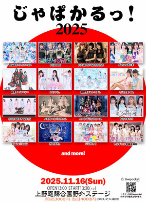 | 11月16日(日) | じゃぱかるっ!2025 会場:上野恩賜公園野外ステージ ![]() 時間:13時30分スタート(予定) 料金:入場時ドリンク購入不要 前売チケット\3000 当日チケット\4000 チケットのご購入はこちら↓ 2025/10/19(日) 10:50 〜 2025/11/15(土) 23:59 ![]() 詳細はTwitterにて (@YGakuenmember) |