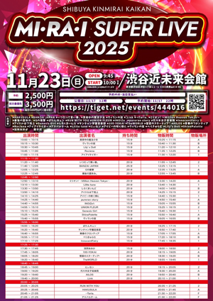 | 11月23日(日) | MI・RA・I SUPER LIVE 2025 会場:渋谷近未来会館 時間:【開場】9:45【開演】10:00(予定) ※変更の可能性ございます 料金 :※各1D別 予約2,500円 前方3,500円 当日500円UP※予約のみ・当日支払 チケットのご購入はこちら↓ ![]() 詳細はTwitterにて (@YGakuenmember) |