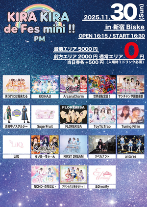 | 11月30日(日) | KIRA KIRA de Fes mini !! PM 会場:新宿Biske 時間:【開場】16:15【開演】16:30 料金:各別途1D 最前エリア5000円 前方エリア2000円 通常エリア0円 当日券各+500円 チケットのご購入はこちら↓ ![]() 詳細はTwitterにて (@YGakuenmember) |